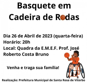 Em sequência à programação da semana "A Inclusão é uma obra de Amor e Respeito", o Departamento Municipal da Educação de Santa Rosa de Viterbo, convida a população para prestigiar o jogo de Basquete em Cadeira de Rodas nesta noite de quarta-feira. A partida acontece às 20h00 na quadra de esportes da Escola Municipal de Ensino Fundamental José Roberto Costa Bruno.