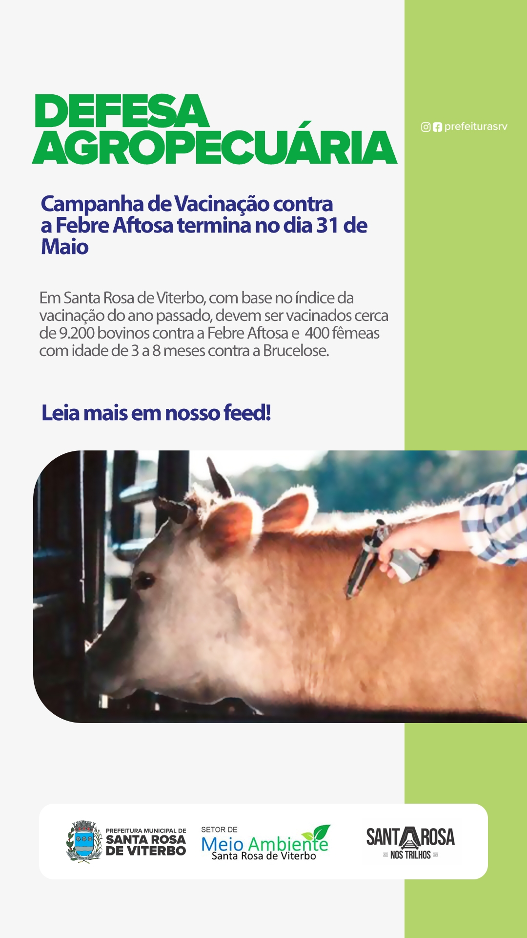 Em Santa Rosa de Viterbo, com base no índice da vacinação do ano passado, devem ser vacinados cerca de 9.200 bovinos e 400 fêmeas. Mais informações pelo telefone (16) 3954-1698. Apoio Prefeitura Municipal e Casa da Agricultura.