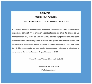 CONVITE PARA AUDIÊNCIA PÚBLICA - METAS FISCAIS 1º QUADRIMESTRE 2023