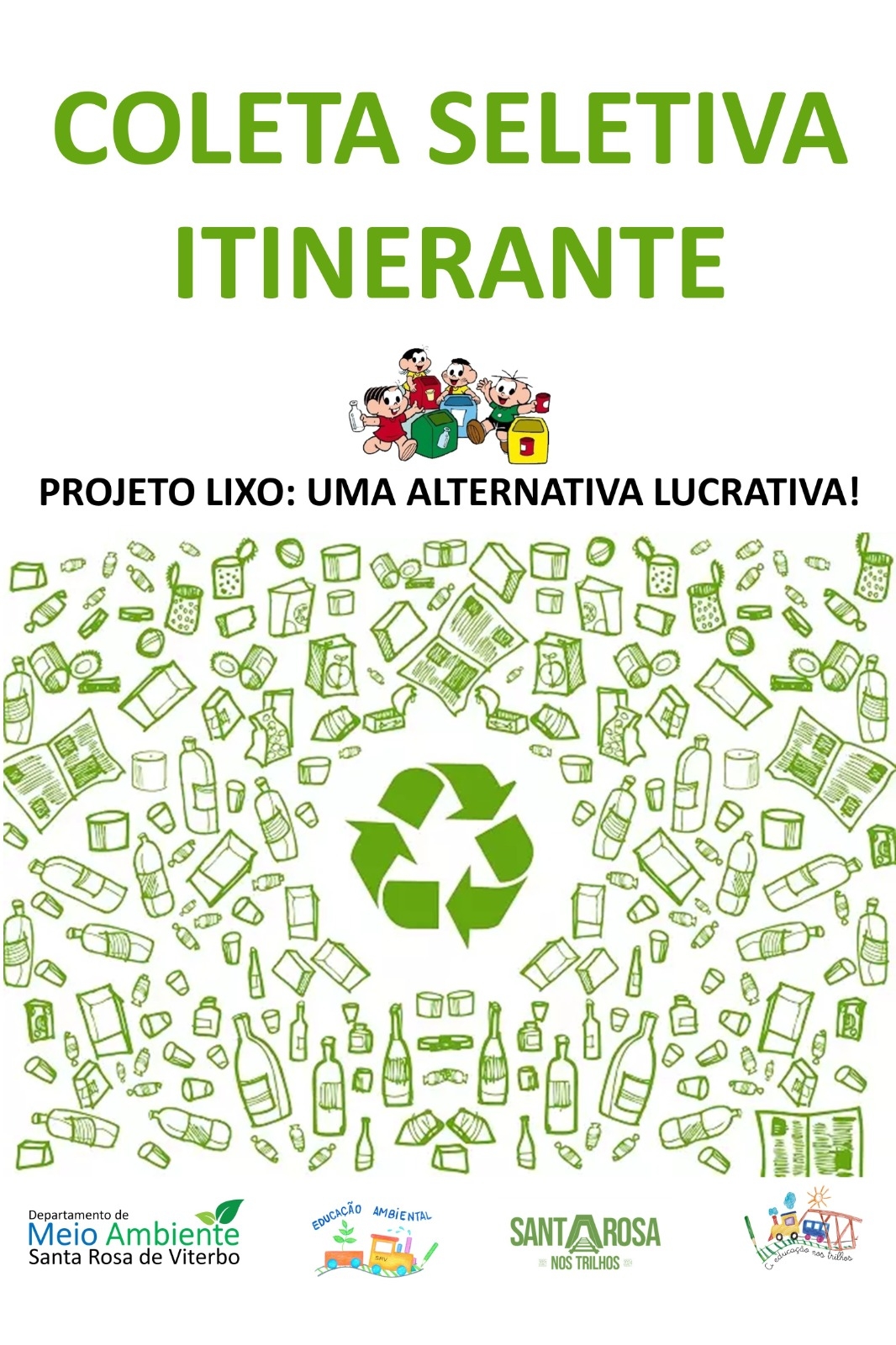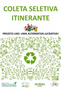 Dando continuação às comemorações da Semana do Meio Ambiente, o Setor de Educação Ambiental convida toda a população para participar da Coleta Seletiva Itinerante, que será realizada neste sábado, dia de junho, em frente ao Centro Cultural no horário da Feira Livre, das 08h00 às 11h00.