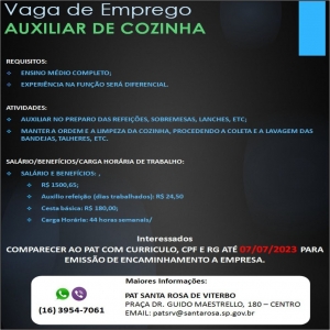 A captação, via PAT, teve início hoje e segue até o dia 07 de julho. Os currículos serão enviados à empresa Oliveira para seleção e posterior contratação de profissionais que trabalharão de forma terceirizada na área da Educação, junto ao Setor da Merenda Municipal.