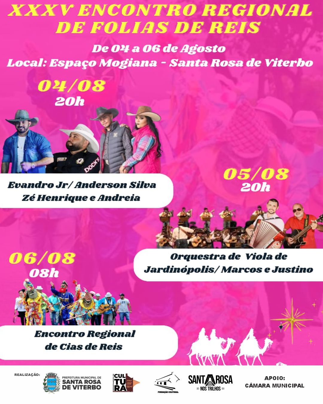 Logo após a Orquestra de Viola de Jardinópolis e a dupla santa-rosense, Marcos e Justino, sobem ao palco para agitar a noite do sabadão e, no domingo, acontece o 35º Encontro de Reis de Santa Rosa de Viterbo, um dos mais tradicionais eventos culturais e religiosos de nossa cidade e da região. São aguardadas cerca de 30 companhias do Estado de São Paulo e do Sul de Minas para as apresentações que começam a partir das 08h00 da manhã.