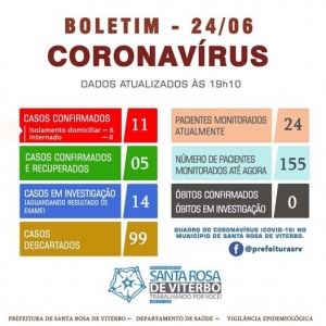 O número de pacientes que testaram positivo para o coronavírus sobe para com 11 casos registrados em Santa Rosa de Viterbo. Do total, 5 pacientes já estão recuperados, enquanto 06 seguem em isolamento domiciliar, monitorados pelo Departamento de Saúde e Setor de Vigilância Epidemiológica.