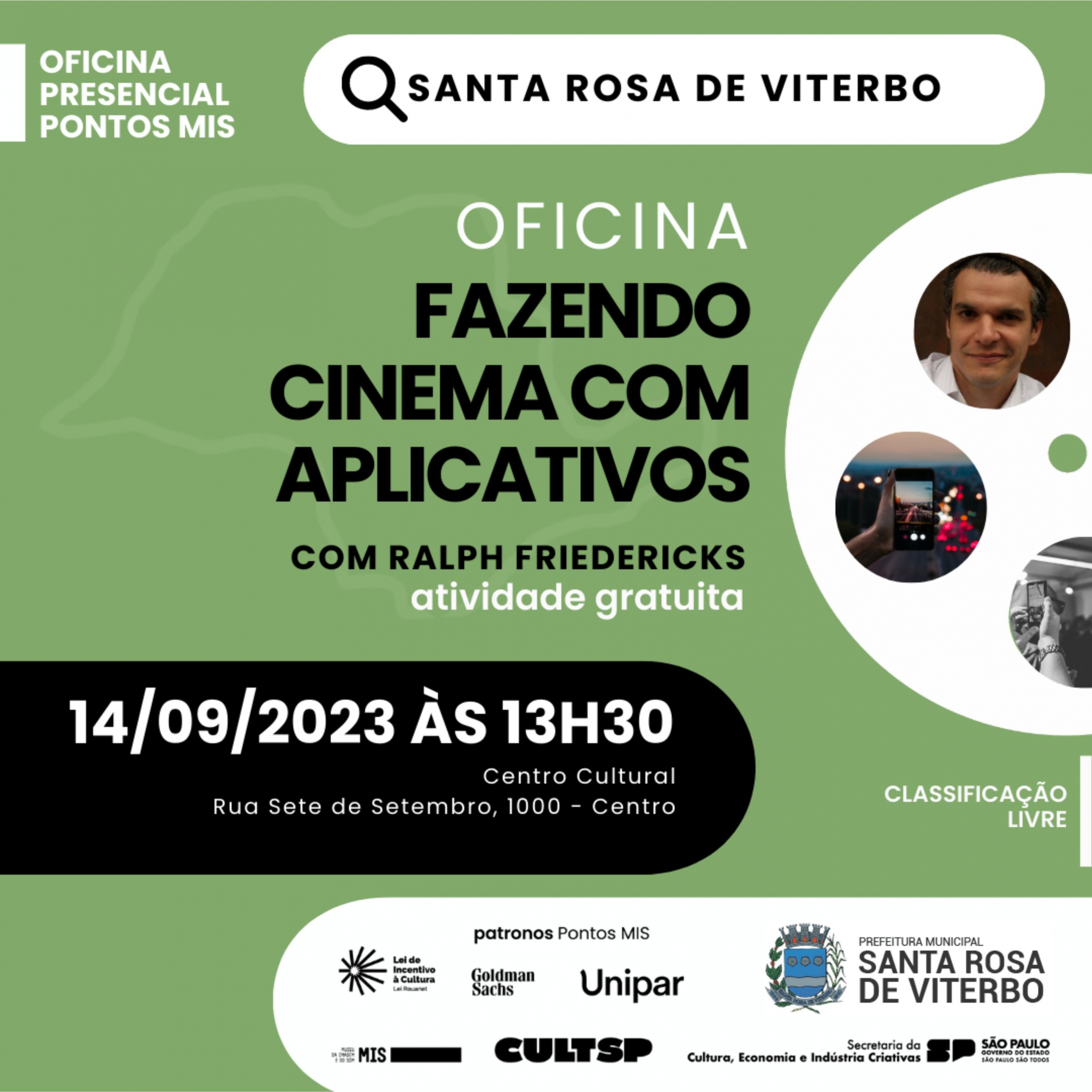 Em parceria com o Pontos MIS o Departamento de Cultura da Prefeitura Municipal promove, no dia 14 de setembro, a Oficina Fazendo Cinema com Aplicativos, ministrada pelo cineasta, fotógrafo e arte-educador, Ralph Friedericks.