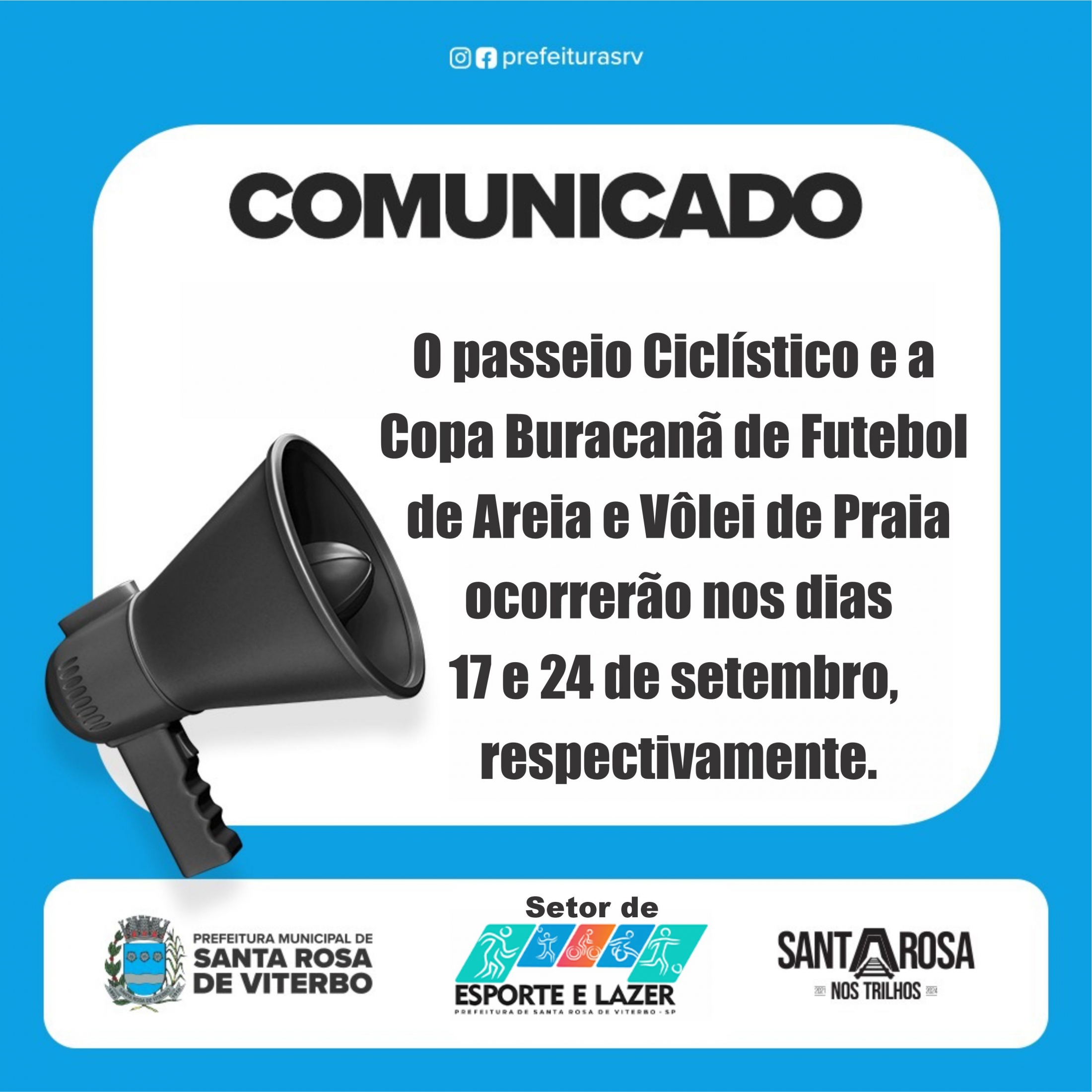 Por conta das condições climáticas o Setor de Esportes da Prefeitura Municipal informa a mudança de data do Passeio Ciclístico, que ficou agendado para o dia 17/09. A Copa Buracanã de Futebol de Areia e Vôlei de Praia também precisou ser remarcada e será realizada no dia 24/09.