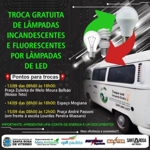 A ação, que acontece de quarta a sexta-feira desta semana, é uma parceria entre a Companhia Paulista de Força de Luz e a Prefeitura Municipal através do Departamento de Meio Ambiente. Na oportunidade os consumidores poderão trocar até 08 lâmpadas antigas por lâmpadas de LED.