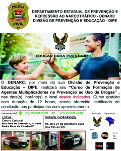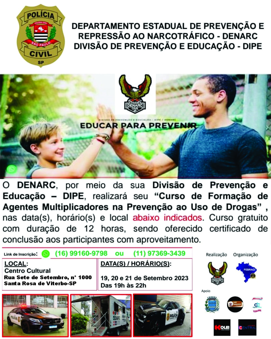 Nos dias 19, 20 e 21 de setembro, Santa Rosa de Viterbo receberá o Curso de "Prevenção ao Uso de Drogas" ministrado pelo Departamento Estadual de Prevenção e Repressão ao Narcotráfico (DENARC), da Polícia Civil do Estado de São Paulo.