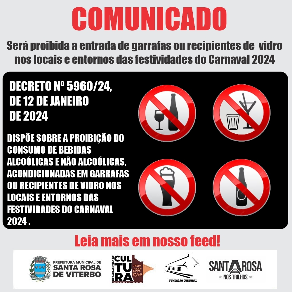 Dentre outras medidas já definidas pelo Departamento de Cultura para garantir a segurança dos foliões no Carnaval 2024, está à proibição de garrafas ou recipientes de vidro nos locais e entornos da tradicional festa popular. O objetivo é resguardar a segurança e a integridade física de todos que participarem da folia marcada para os dias 10, 11, 12 e 13 de fevereiro.