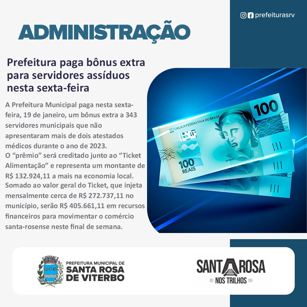 A Prefeitura Municipal paga nesta sexta-feira, 19 de janeiro, um bônus extra a 343 servidores municipais que não apresentaram mais de dois atestados médicos durante o ano de 2023.