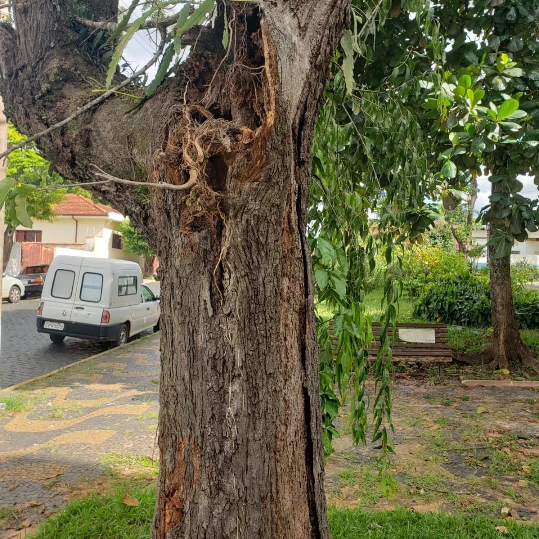 “Estas espécies exóticas estão no fim da vida delas e apresentam sintomas bem ruins, por dentro estão ocas e com a sustentação comprometida. Já temos algumas ocorrências de quedas de galhos e neste caso o ideal, por questão de segurança, é a substituição” explica Camila Fedel, Diretora de Meio Ambiente.