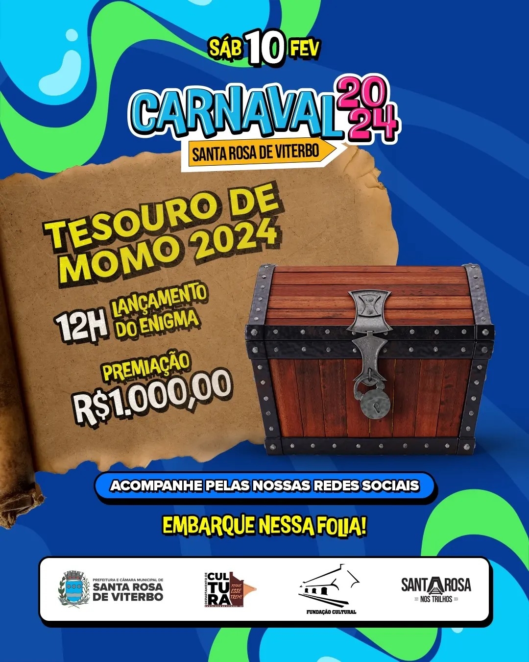A Caça ao Tesouro de Momo, criação do professor Renato Alberto Antunes e do fazendeiro Ivan Alvim de Freitas, teve sua primeira edição no Carnaval de 1981. O jornal ‘Santa Rosa Notícias’ começou a circular às 13 horas do dia 27 de fevereiro daquele ano com a primeira pista publicada no suplemento especial denominado “Ripa na Chulipa”. Quatro horas e 45 minutos depois a brincadeira teve fim. Omar Nagib Moussa e Alberto Lerco Coelho (Tiura) – atuais prefeito e presidente da Câmara de Santa Rosa – formaram a equipe (do qual fez parte também Alex Moussa) que encontrou o Tesouro e recebeu o prêmio. Naquele evento os participantes se inscreveram em grupos, e só dois, além do vencedor, chegaram à última mensagem: as duplas Aparecido Tadeu de Oliveira (Tadeuzão da Caixa) / Chico Alencar (atual Deputado Federal), e Edmar Titarelli Esteves / Roberto Nogueira Juns. O Carnaval de 81 (ano não-bissexto) começou no dia 27 de fevereiro (sexta-feira) e foi até o dia 3 de março. De hoje até a próxima sexta-feira novas informações e curiosidades serão publicadas neste espaço, sempre a partir de meio dia. No sábado, mesmo horário, sai o enigma que leva ao Tesouro.