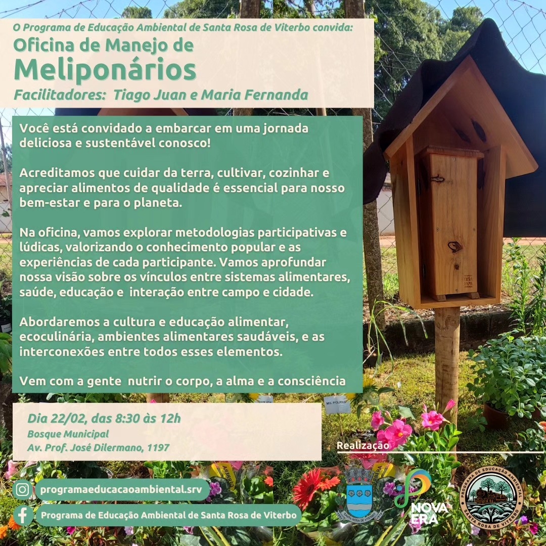 Durante a oficina, exploraremos técnicas inovadoras e sustentáveis de manejo de Meliponários, proporcionando conhecimento prático sobre a criação e preservação das abelhas nativas sem ferrão. Esta jornada educativa e envolvente oferecerá aos participantes a chance de aprender sobre a importância vital das abelhas sem ferrão, conhecer métodos sustentáveis de manejo, participar de demonstrações práticas e esclarecer todas as dúvidas com especialistas dedicados ao tema.
