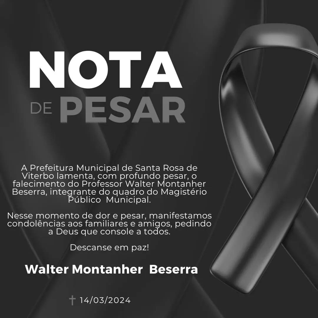 O Departamento de Educação da Prefeitura Municipal de Santa Rosa de Viterbo lamenta, com profundo pesar, o falecimento do Professor Walter Montanher Beserra, integrante do quadro do Magistério Público Municipal.