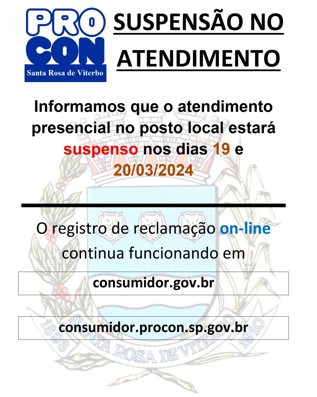 PROCON informa: O atendimento presencial no posto local estará suspenso nos dias 19 e 20/03/2024.