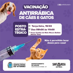 O Serviço Veterinário Municipal informa que estará aplicando vacina Antirrábica em cães e gatos nesta terça-feira, das 09h00 às 11h00, na Praça Zuleika de Melo Moura Balbão (Bairro Nosso Teto).