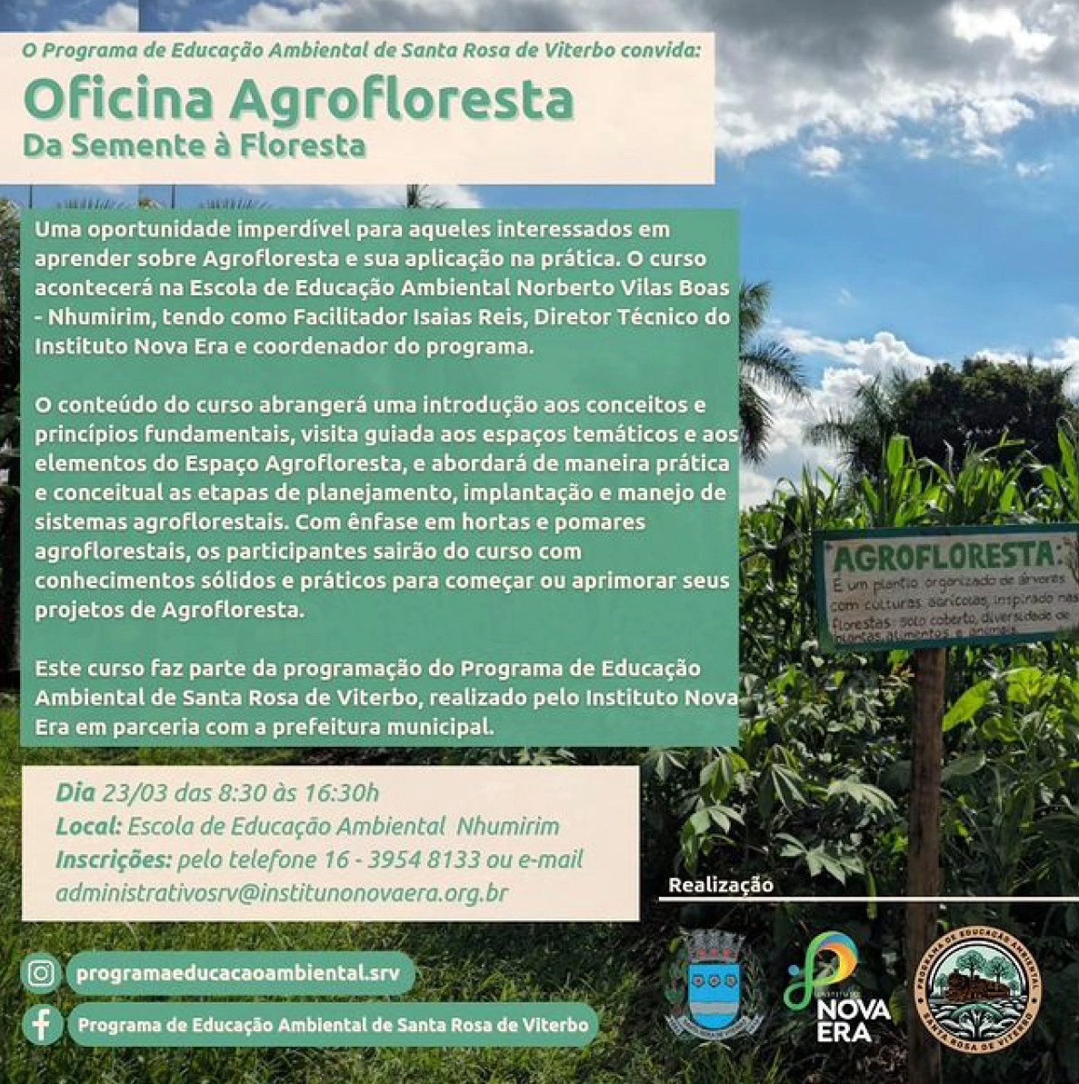 Este curso é parte da programação do Programa de Educação Ambiental de Santa Rosa de Viterbo, realizado pelo Instituto Nova Era.