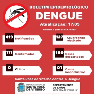 O Departamento de Saúde de Santa Rosa de Viterbo informa a população que circula no município o vírus tipo 1 da Dengue. Este tipo de vírus pode causar sintomas mais graves da doença e exige uma atenção redobrada por parte de todos.