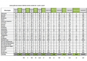 Atualização de casos e óbitos COVID-19 nos 26 municípios da área de abrangência do DRS XIII, de 13/07 até 20/07, dados fornecidos ao DRS pelo GVE COM BASE EM RESULTADOS LABORATORIAIS, DADOS FORNECIDOS PELAS VIGILÂNCIAS EPIDEMIOLÓGICAS MUNICIPAIS E DADOS INSERIDOS NOS DOIS BANCOS DE DADOS OFICIAIS: O E-SUS VE E O SIVEP-GRIPE.