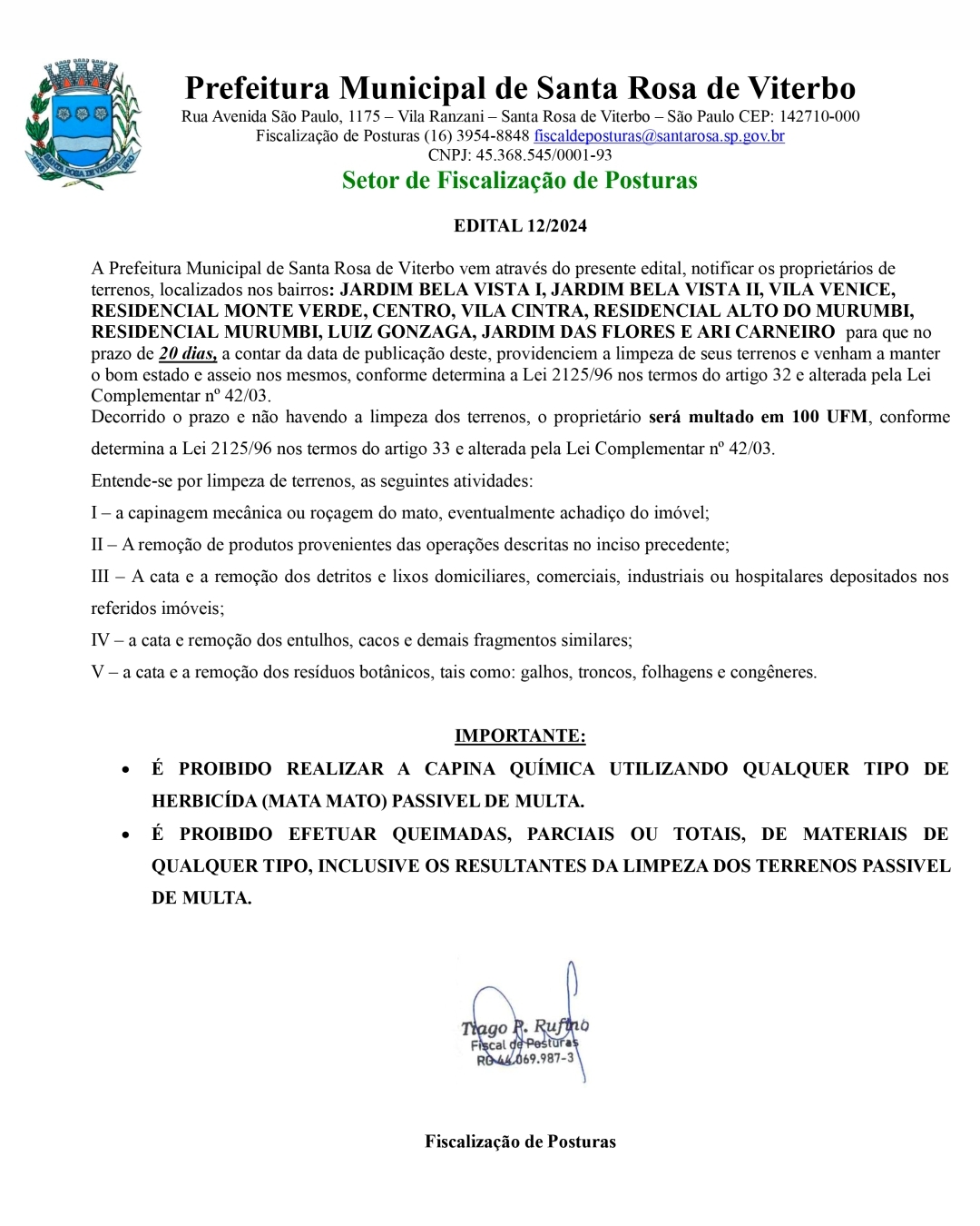 O Setor de Fiscalização de Posturas, vem, através do EDITAL 12/2024, notificar os proprietários de terrenos localizados nos seguintes bairros: JARDIM BELA VISTA I, JARDIM BELA VISTA II, VILA VENICE, RESIDENCIAL MONTE VERDE, CENTRO, VILA CINTRA, RESIDENCIAL ALTO DO MURUMBI, RESIDENCIAL MURUMBI, LUIZ GONZAGA, JARDIM DAS FLORES E ARI CARNEIRO, para que providenciem a limpeza de seus terrenos dentro do prazo de 20 dias, contados a partir da data de publicação deste edital.