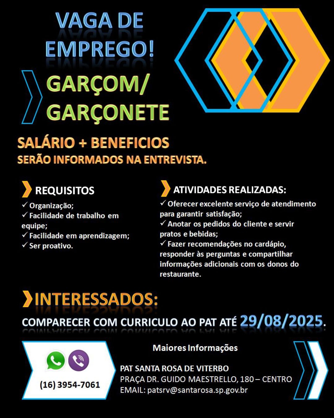 Vagas de emprego. Mais informações no PAT de Santa Rosa de Viterbo.