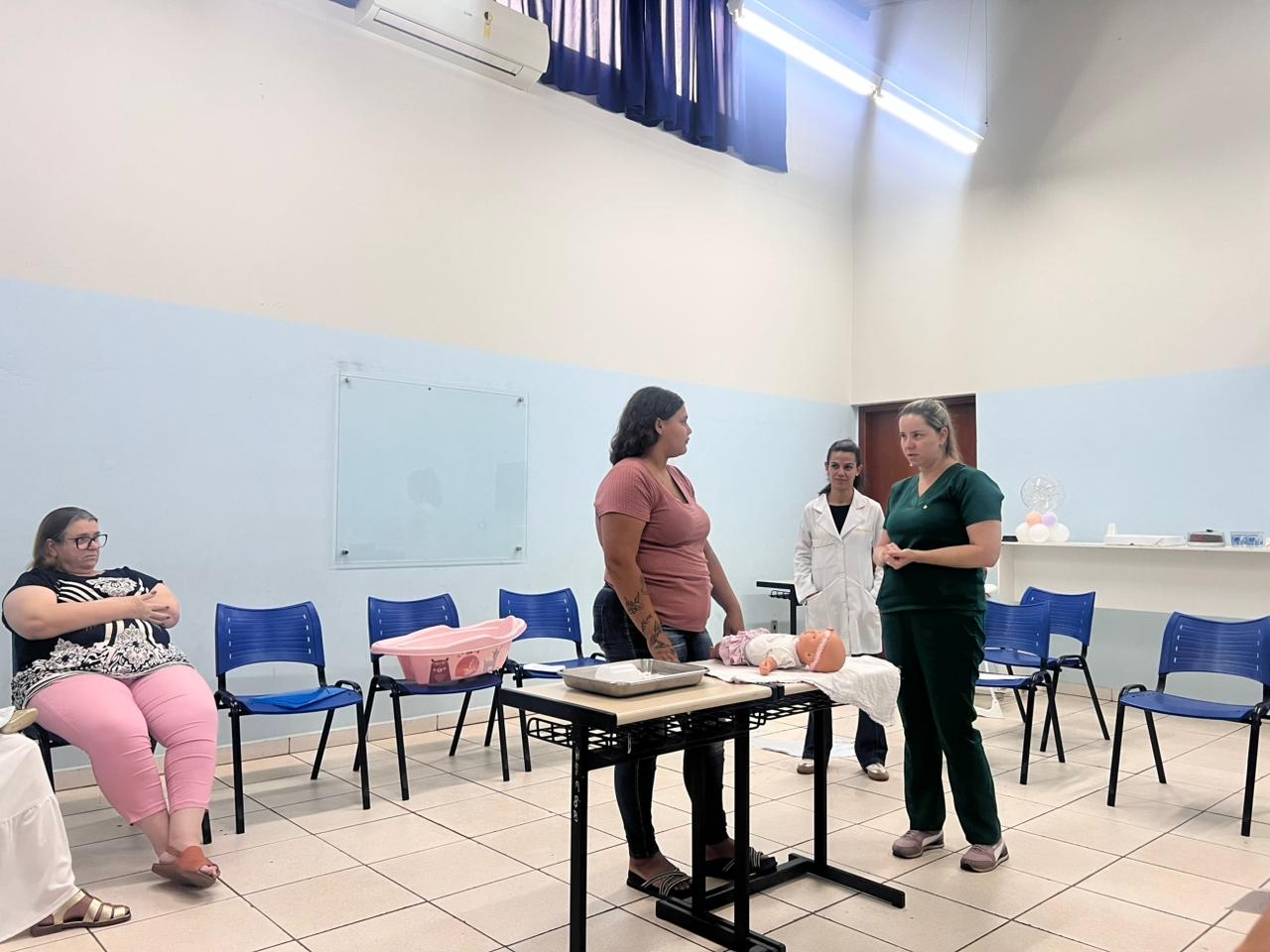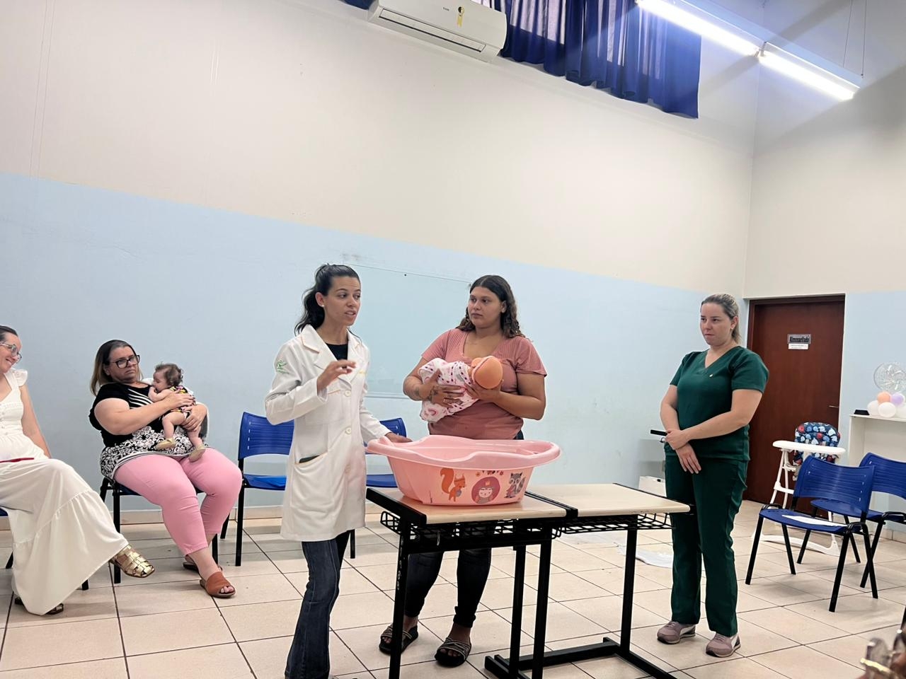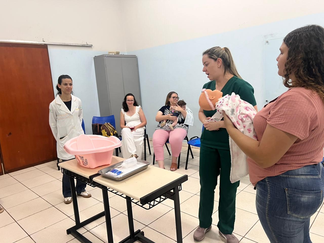 Além disso, as enfermeiras Adriana, Natália, Rinara e Adriele conduziram uma oficina prática de cuidados com o recém-nascido, abordando desde o banho e higiene até recomendações essenciais para a segurança e o bem-estar do bebê.