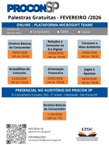 A Fundação Procon-SP informa a agenda das Palestras (online e presencial), que serão realizadas no mês de fevereiro de 2026.