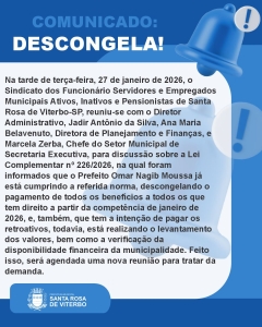 Na tarde de terça-feira, 27 de janeiro de 2026, o Sindicato dos Funcionário Servidores e Empregados Municipais Ativos, Inativos e Pensionistas de Santa Rosa de Viterbo-SP, reuniu-se com o Diretor Administrativo, Jadir Antônio da Silva, Ana Maria Belavenuto, Diretora de Planejamento e Finanças, e Marcela Zerba, Chefe do Setor Municipal de Secretaria Executiva, para discussão sobre a Lei Complementar nº 226/2026, na qual foram informados que o Prefeito Omar Nagib Moussa já está cumprindo a referida norma, descongelando o pagamento de todos os benefícios a todos os que tem direito a partir da competência de janeiro de 2026, e, também, que tem a intenção de pagar os retroativos, todavia, está realizando o levantamento dos valores, bem como a verificação da disponibilidade financeira da municipalidade. Feito isso, será agendada uma nova reunião para tratar da demanda.