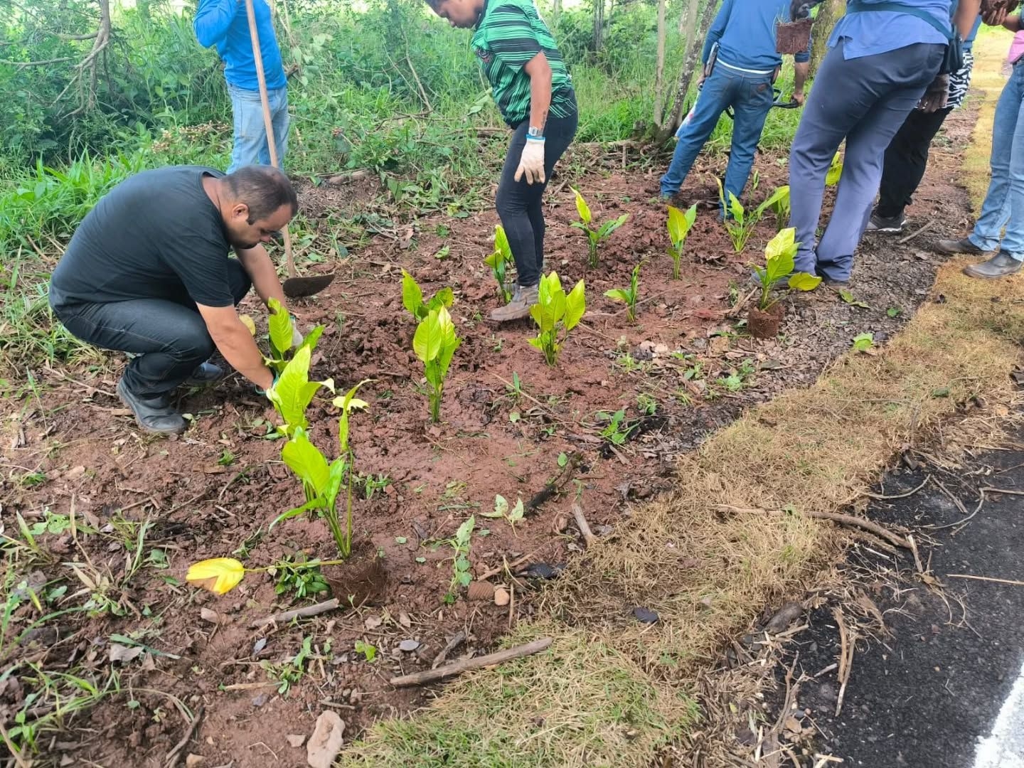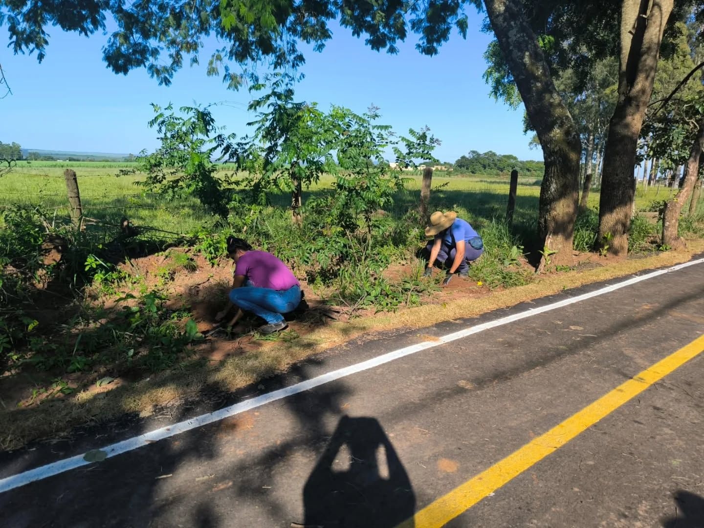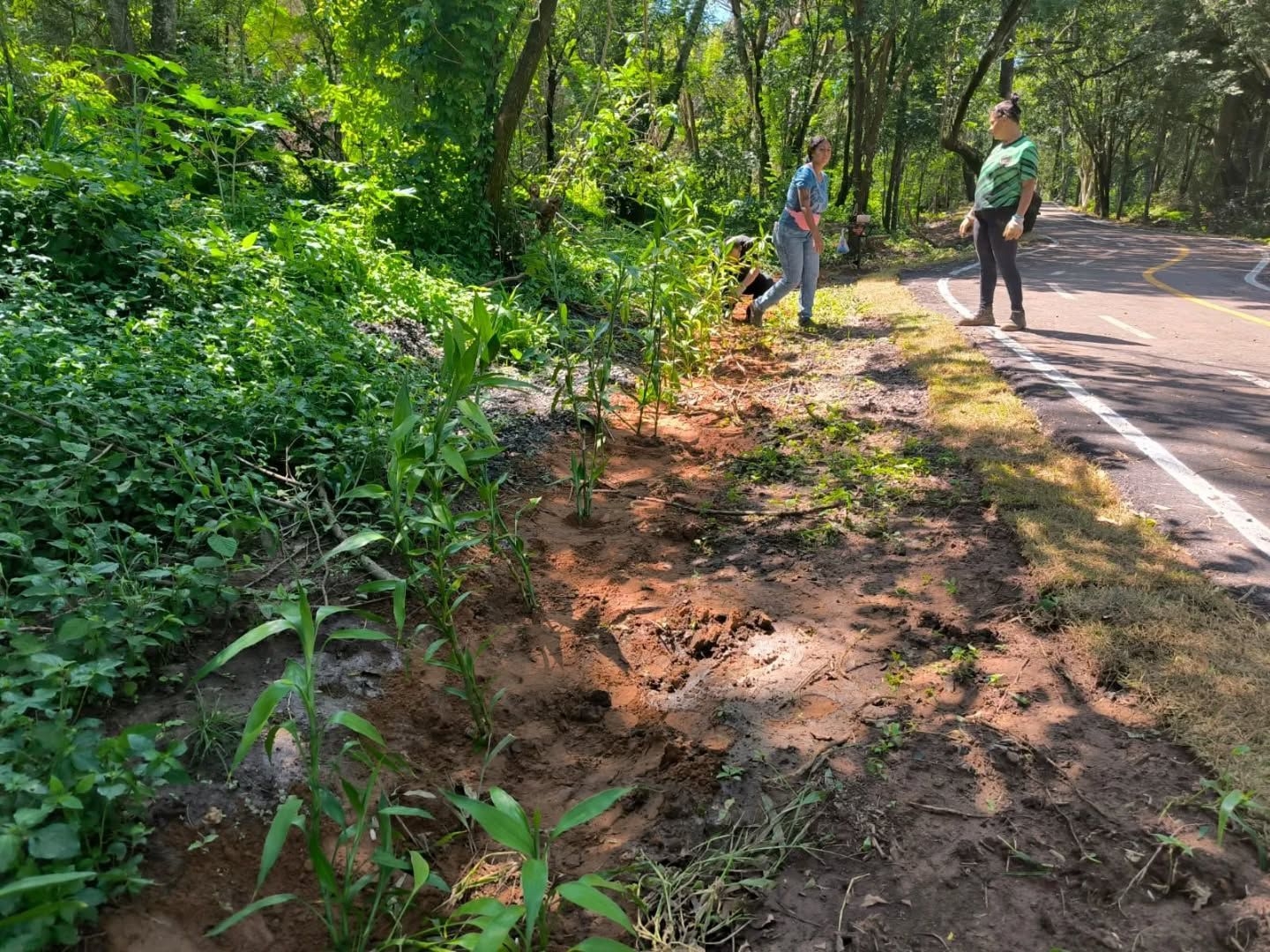 O Departamento de Meio Ambiente está realizando o plantio de árvores frutíferas e plantas ornamentais ao longo da ciclovia e da trilha de caminhada do Tirisco, na estrada de Nhumirim.