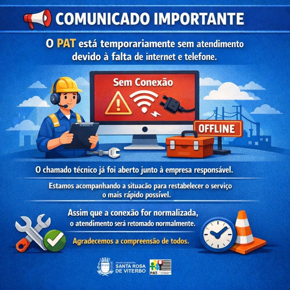 O PAT está temporariamente sem atendimento devido à falta de internet e telefone.