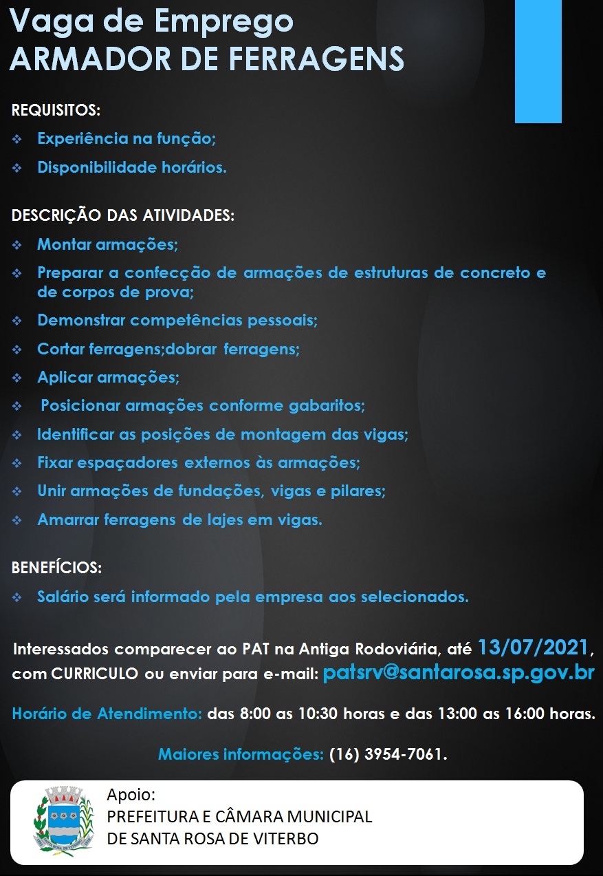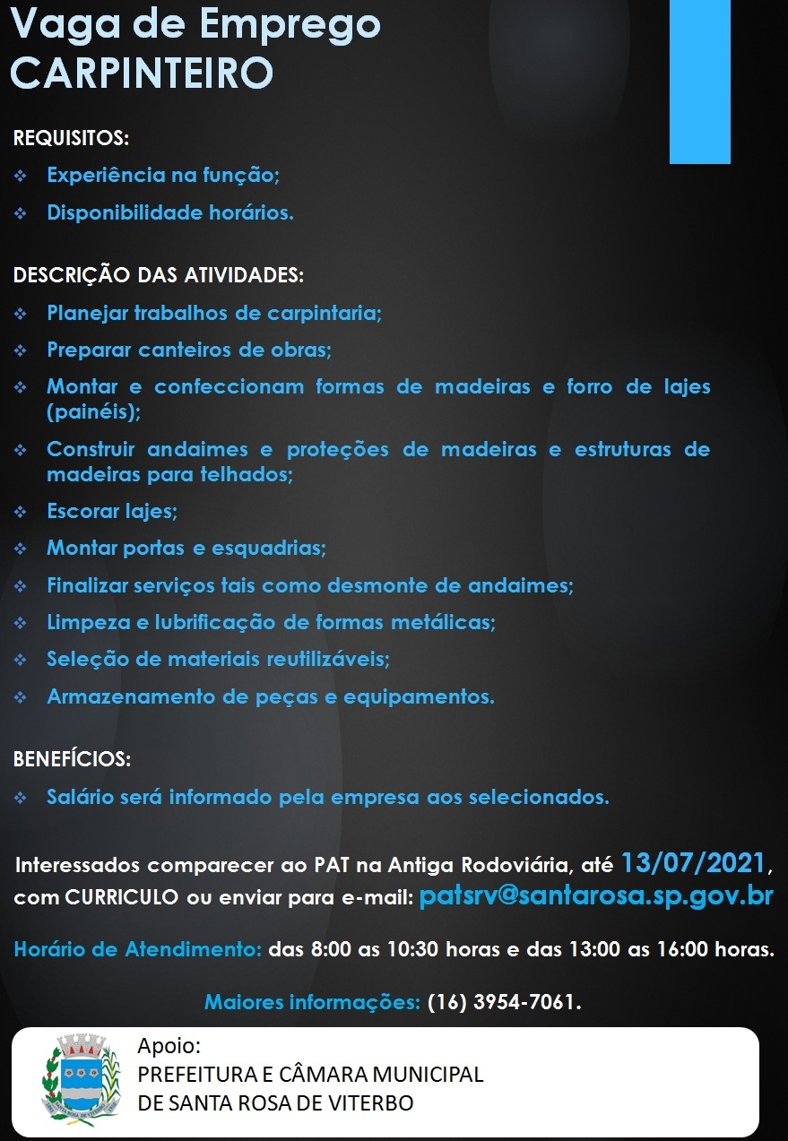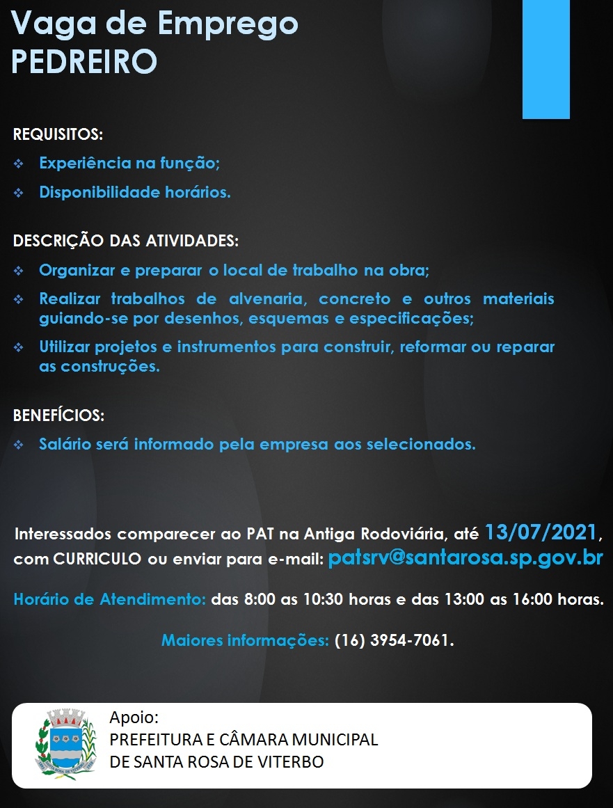 Interessados devem comparecer ao PAT, na antiga rodoviária, até 13 de julho, das 08h às 11h e das 13h às 16h com seu currículo, ou enviar para o e-mail: patsrv@santarosa.sp.gov.br.