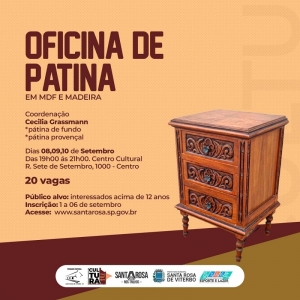 A Prefeitura de Santa Rosa de Viterbo, por meio do Departamento de Cultura e a Fundação Cultural, abriu nesta quarta-feira (1º) as inscrições para a “Oficina de Pátina em MDF e Madeira”, que acontecerá, de forma presencial, nos dias 8, 9 e 10 de setembro, das 19h às 21h, no Centro Cultural, localizado na rua Sete de Setembro, 1000 – Centro.