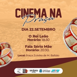 A Prefeitura Municipal de Santa Rosa de Viterbo exibirá os filmes “O Rei Leão” e “Fala Sério, Mãe” nesta quarta-feira, às 18h30 e 20h30, respectivamente. O evento é gratuito e acontecerá na Praça Zuleika de Moura Balbão (Nosso Teto).