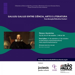 As inscrições para oficina “Galileu Galilei entre a ciência, arte e literatura” podem ser feitas até o dia 5 de outubro, através do link: https://forms.gle/41y7L3hexxxNeN4XA.No total são oferecidas 40 vagas.