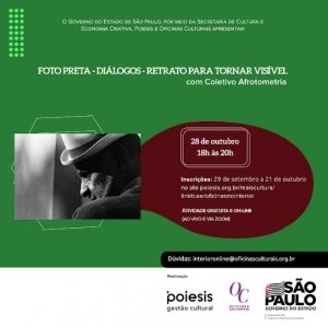 Com coordenação do Coletivo Afrotometria, o debate “Foto Preta – Diálogos” tem como convidado Wagner Celestino e mediação de Tiago Alexandre Santana. A atividade acontece 28 de outubro, das 18h às 20h. São disponibilizadas 60 vagas para um público com idade acima de 16 anos, sendo que serão selecionados os primeiros inscritos. As inscrições ocorrem até o dia 21 de outubro, por meio do link https://forms.gle/5itdq4PayEeTNuvHA