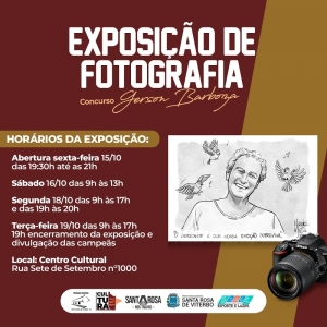 O Departamento Municipal de Cultura inicia nesta sexta-feira (15), a partir das 19h30, a exposição do 1° Concurso Fotográfico “Gerson Barboza”. Serão expostas as 26 fotos inscritas no concurso no Centro Cultural.