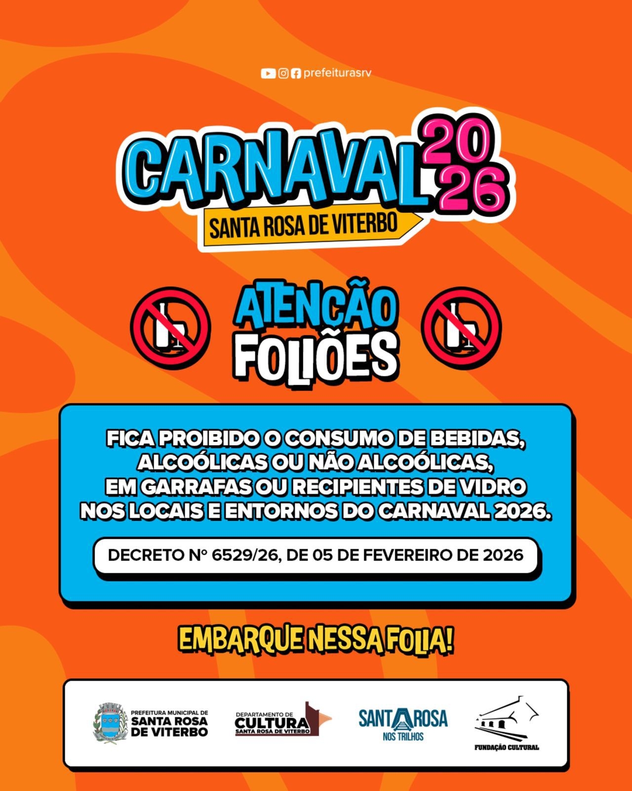 A Prefeitura de Santa Rosa de Viterbo publicou, nesta quarta-feira (5), o Decreto nº 6.529/26, que estabelece a proibição do consumo de bebidas alcoólicas e não alcoólicas acondicionadas em garrafas ou recipientes de vidro nos locais e entornos das festividades do Carnaval 2026, que acontecerá entre os dias 14 e 17 de fevereiro no município.