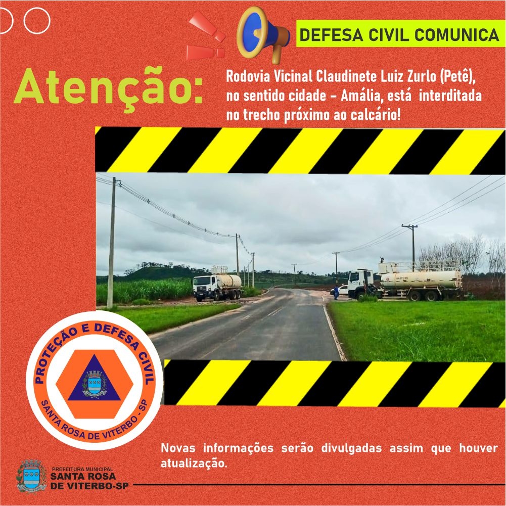 A Defesa Civil informa que a Rodovia Vicinal Claudinete Luiz Zurlo (Petê), no sentido cidade – Amália, está interditada no trecho próximo ao calcário, para limpeza de barreira que caiu sobre a pista. As equipes atuam no local para garantir a segurança e a liberação adequada da via.