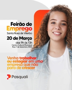 No dia 20 de março, das 9h às 13h, no Centro Cultural Municipal, participe dessa grande oportunidade para trabalhar ou estagiar em uma empresa que não para de crescer.