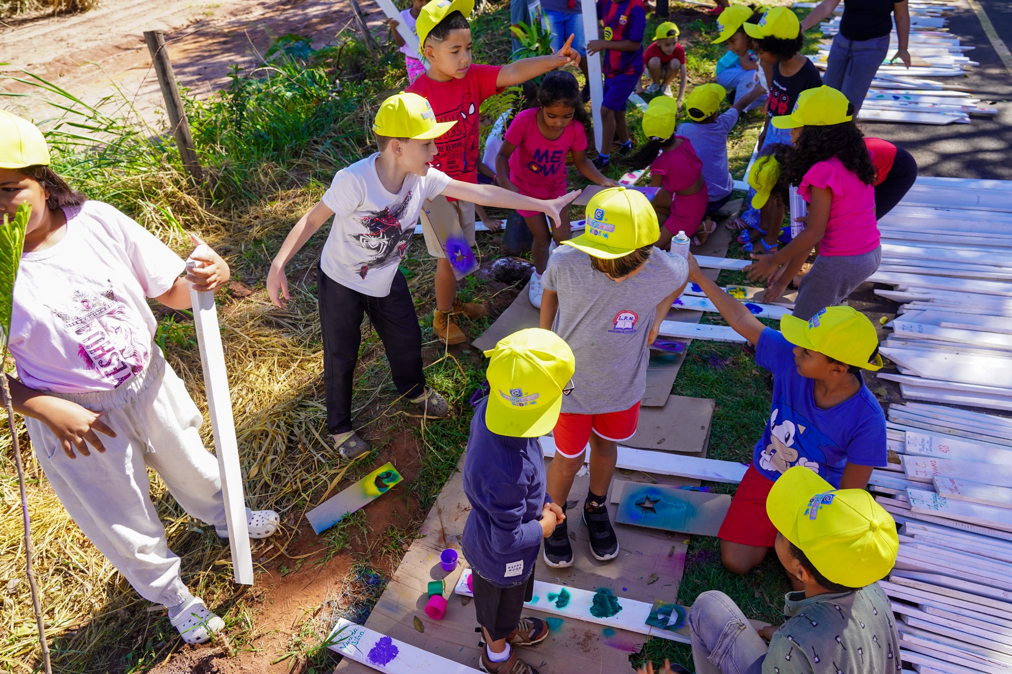 Sob um clima de entusiasmo e cuidado, crianças e adultos compartilharam um gesto simples, mas carregado de significado: plantar o futuro. As crianças foram protagonistas da atividade, participando diretamente do plantio e deixando sua marca no local ao fincarem estacas com seus nomes e desenhos feitos por elas mesmas ao lado de cada muda, criando um vínculo afetivo com as árvores e com o espaço.