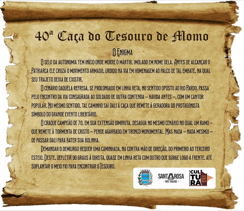 O enigma da Caça ao Tesouro de Momo foi divulgado neste sábado (26) pela Prefeitura Municipal. O evento é promovido pelo Departamento Municipal de Cultura e pela Fundação Cultural.