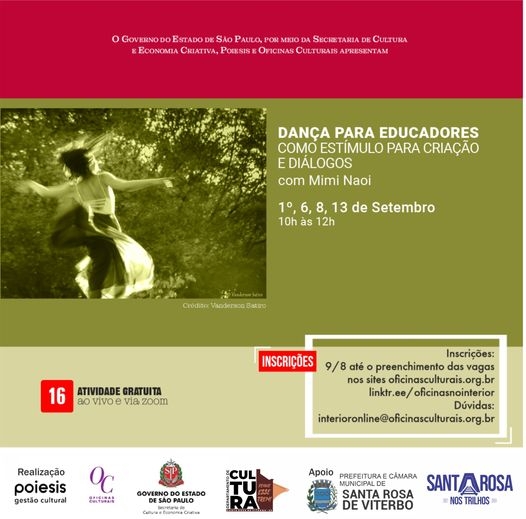 A oficina explora a dança como ferramenta de criação, expressão corporal e conexão entre as diferentes áreas do conhecimento. Em um primeiro momento, estimula-se a investigação em dança pelos próprios educadores e público interessado; em um segundo momento, demonstra-se como os educadores podem aplicam os exercícios e técnicas em sala de aula, a fim de que seus alunos despertem em si a dança e seu potencial interlinguístico.