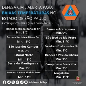 A Defesa Civil do Estado alerta que, entre quinta-feira (18) e domingo (21), uma intensa massa de ar polar avançará em todo o território paulista, inclusive em nossa região, provocando queda acentuada de temperatura, havendo momentos de frio intenso, com destaque às regiões mencionadas.