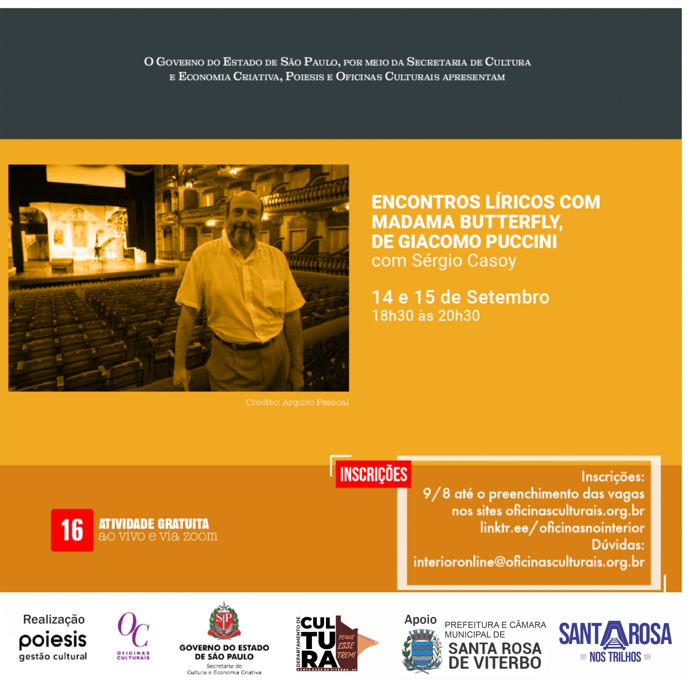 O formato denominado “Encontro Lírico” consiste em, tomando uma determinada ópera como tema, discorrer sobre suas origens e detalhes que envolvem sua criação – apoiada por exibição de imagens via Power Point – e a em seguida exibir e comentar, em vídeo, seus trechos mais significativos, retirados de várias produções daquela ópera para que os alunos possam, além de se familiarizar com o canto, comparar e constatar às várias possibilidades de produção teatral que um mesmo tema pode oferecer. Madama Butterfly, estreada em 1904, é a primeira ópera que Puccini compõe no século XX, e também sua primeira incursão em um ambiente exótico, sendo ambientada em Nagasaki, no Japão, à época da composição. Apesar da estreia desastrosa no Teatro Alla Scala de Milão, Puccini reviu a partitura e tornou a apresentá-la três meses depois, quando obteve um sucesso extraordinário e duradouro, que se estende até os nossos dias. Madama Butterfly continua sendo uma das óperas mais representadas do mundo.Com Sergio Casoy, professor e pesquisador de música lírica, autor de “A invenção da ópera” e "Ópera de outros cantares
