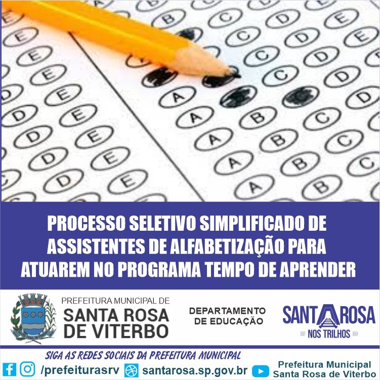 O DIRETOR MUNICIPAL DE EDUCAÇÃO de Santa Rosa de Viterbo, Estado de São Paulo, no uso de suas atribuições legais e regulamentares, tendo em vista o disposto Portaria nº 280, de 19 de fevereiro de 2020, consolidado pela Resolução MEC nº 06, de 20 de abril de 2021, torna pública a abertura de inscrições para o Processo Seletivo Simplificado para preenchimento das vagas de Assistente de Alfabetização na condição de voluntário nas unidades escolares participantes do Programa Tempo de Aprender/2022. O programa observa as determinações da Lei de Diretrizes e Bases da Educação Nacional – LDB, Lei n°9.364, de 20 de dezembro de 1996, bem como da Base Nacional Comum Curricular – BNCC, Resolução CBE/CP n° 2, de 22 de dezembro de 2017, com relação ao desenvolvimento da capacidade de aprender, tendo como meios básicos o pleno domínio da leitura, da escrita e do cálculo, no âmbito da rede pública municipal de ensino de Santa Rosa de Viterbo.