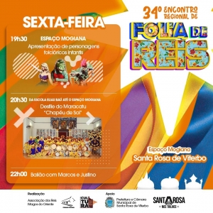 A sexta-feira está recheada de atrações para as crianças e adultos se divertirem no 34º Encontro Regional de Folias de Reis, em Santa Rosa de Viterbo.