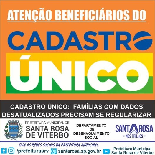 O Departamento de Desenvolvimento Social da Prefeitura Municipal de Santa Rosa de Viterbo, juntamente com sua Equipe do Cadastro Único para Programas Sociais, convoca as famílias inscritas no Cadastro Único e que estão com seus respectivos cadastros desatualizados a mais de 24 meses. O Diretor do Departamento Social, o Sr. Emílio José Costa, informa que é suma importância para essas famílias realizarem as atualizações cadastrais dentro do prazo para garantir a permanência nos Programas e Projetos Sociais ofertados pelo Departamento Social, evitando bloqueios e cancelamentos.