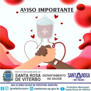 Neste sábado, 20 de agosto, das 07h00 às 12h00, acontecerá mais uma Campanha de Doação de Sangue. A ação, coordenada pela Prefeitura de Santa Rosa de Viterbo, através do Departamento Municipal de Saúde e o Hemocentro de Ribeirão Preto, ocorrerá na escola Maurilio de Oliveira, localizada à Rua Efren Testa, número 39, bairro Cohab I.