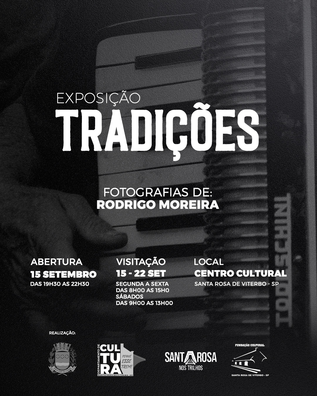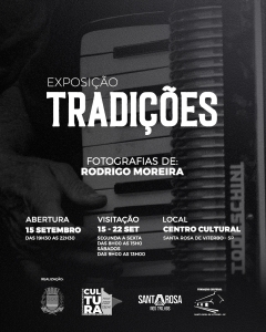 A exposição Tradições trará ao público uma seleção de 15 fotografias capturadas no 34º Encontro de Folia de Reis de Santa Rosa de Viterbo pelo fotógrafo Rodrigo Moreira. O Encontro marcou a retomada do evento após 03 anos de suspensão do evento devido a Pandemia.