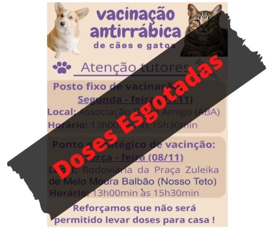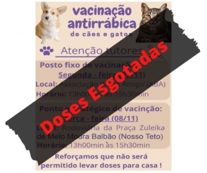 As doses de Vacina Antirrabica para vacinação de cães e gatos no bairro Nosso Teto nesta terça-feira já se esgotaram.