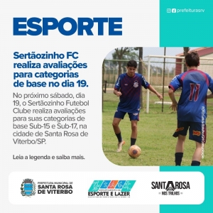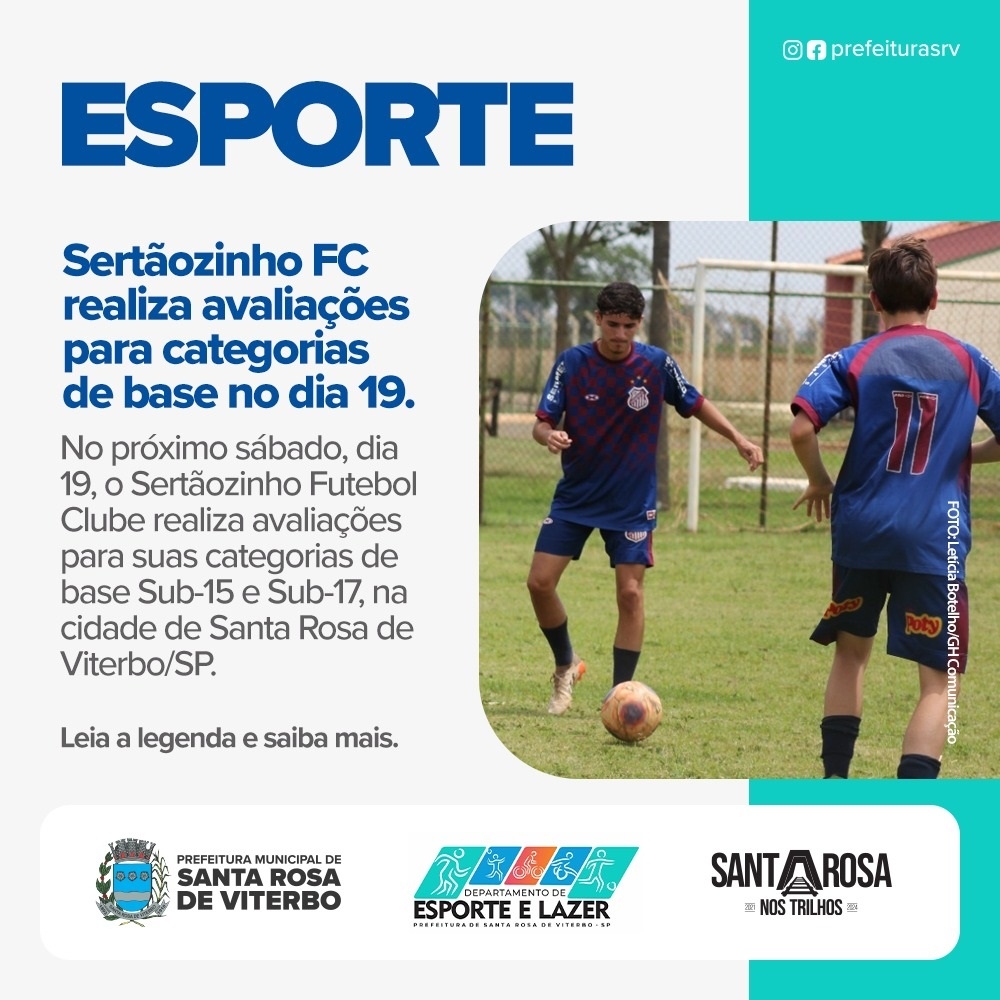 No próximo sábado, dia 19, o Sertãozinho Futebol Clube realiza avaliações para suas categorias de base Sub-15 e Sub-17, na cidade de Santa Rosa de Viterbo/SP. A ação é uma parceria com a Prefeitura local, através do Departamento de Esporte e Lazer.